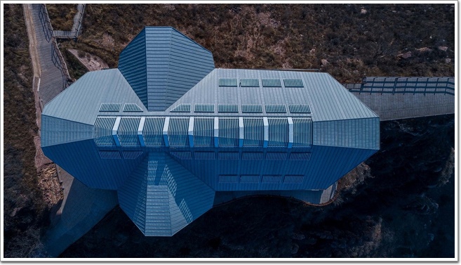 項(xiàng)目平面為長十字形,以適應(yīng)山崖形狀并強(qiáng)調(diào)景觀朝向。雙坡屋面經(jīng)過切削,中部隆起,在懸崖之上蓄勢(shì)待發(fā)。正脊實(shí)為半通透的金屬格柵,以隱藏下部平整的天窗,也柔化了建筑輪廓,如同魚鰭。