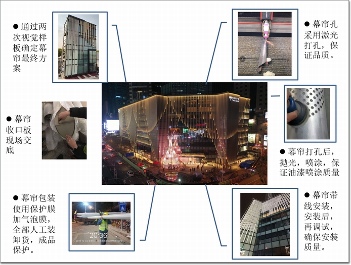 外幕簾的視覺沖擊決定了高品質(zhì)完成幕簾安裝是施工的重難點。金螳螂團隊通過視覺樣板安裝,反復(fù)觀樣,確定簾幕的最終方案。由于地處鬧市,且是舊樓改造項目,施工現(xiàn)場外圍幾乎無材料堆場,施工場地狹小,各專業(yè)同時施工,施工場地成了各家必爭之地。金螳螂團隊以公司為中轉(zhuǎn)場地,合理安排材料進場時間,進場材料及時消化,安裝上墻。同時積極主動配合業(yè)主單位協(xié)調(diào)工作,劃分各單位專用室內(nèi)臨時堆場,高效利用有限的臨時場地,積極推動項目進度。
