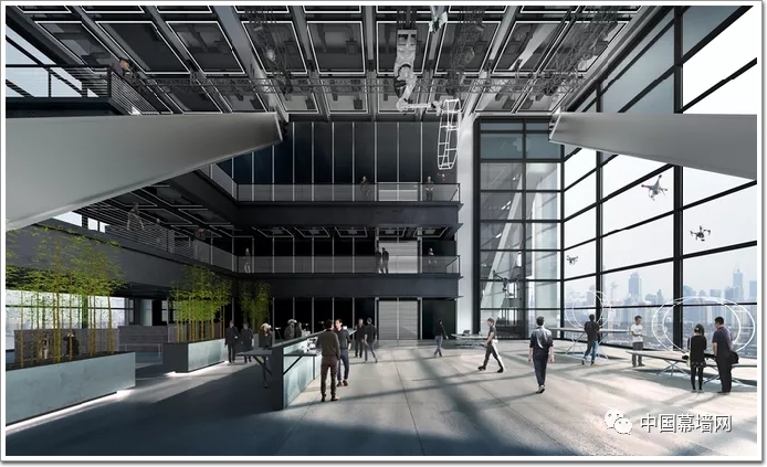 工程具有扭轉(zhuǎn)不規(guī)則、凹凸不規(guī)則、平面(詞條“平面”由行業(yè)大百科提供)組合、樓板(詞條“樓板”由行業(yè)大百科提供)不連續(xù)、側(cè)向剛度尺寸突變、抗側(cè)力構(gòu)件不連續(xù)等不規(guī)則項的特點。而內(nèi)部,這座建筑推翻了辦公空間的傳統(tǒng)理念,在空中構(gòu)建出一個全新的創(chuàng)意社區(qū),除了壯觀的玻璃廊橋、令人印象深刻的大而無柱的內(nèi)部空間,還包括四倍高度的無人機(jī)飛行測試實驗室。