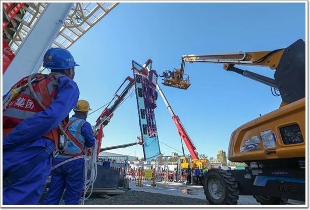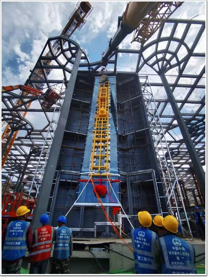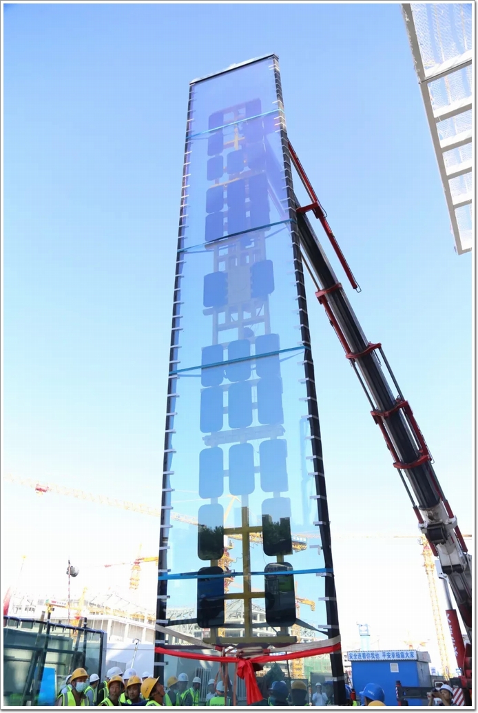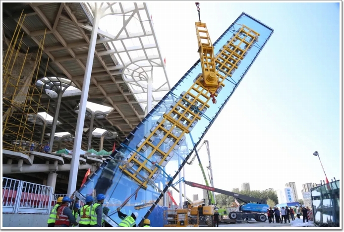 而在中建深裝負(fù)責(zé)的施工標(biāo)段,2021年10月11日,也完成了首款超大幕墻玻璃的掛裝工作。