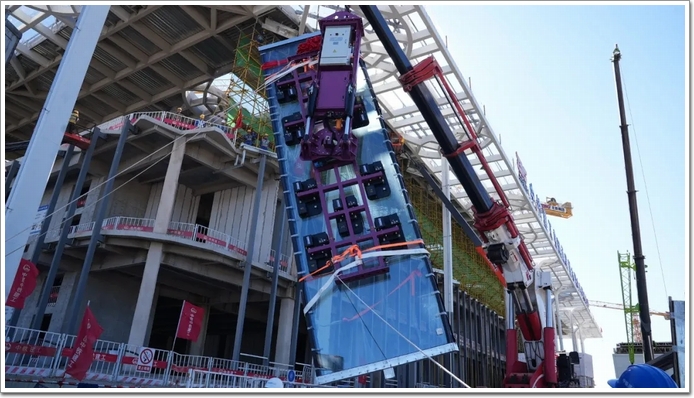 其中最大一塊超大玻璃高15.05米、寬2.5米、重達(dá)11.5噸,吊裝吸盤則采用特制大吸盤,無極萬向調(diào)節(jié),28組大吸力吸盤同時(shí)工作,超級(jí)裝備自重超過3噸。由于大玻璃間夾角不同,板塊角度在74度至133度間變化,外型酷似風(fēng)琴結(jié)構(gòu)。
