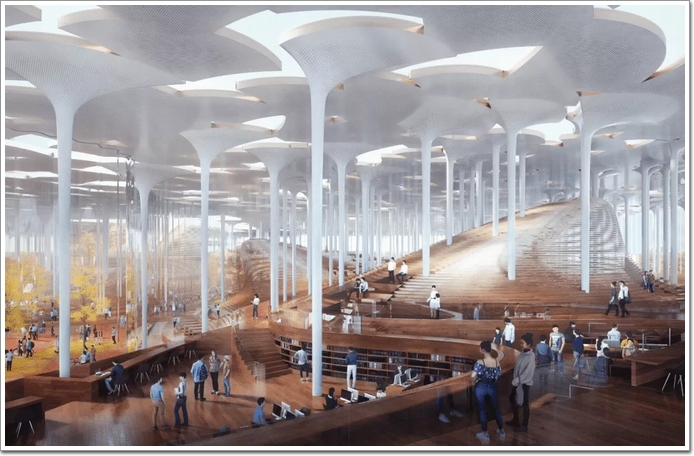 圖書館內(nèi)部將呈現(xiàn)“山谷門廳”的景致。讀者在圖書館任意一個(gè)公共區(qū)域,都能看到外面的園林綠化景觀,蜿蜒的主通道兩側(cè)區(qū)域形似山坡上的梯田,每一層都可供市民閱讀休閑,讓大家享受“臨山間于樹下”的閱讀體驗(yàn)。